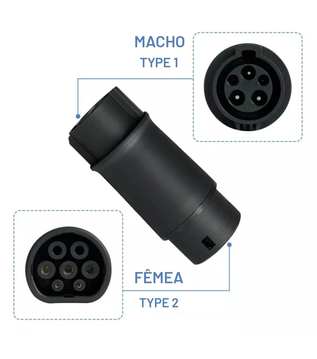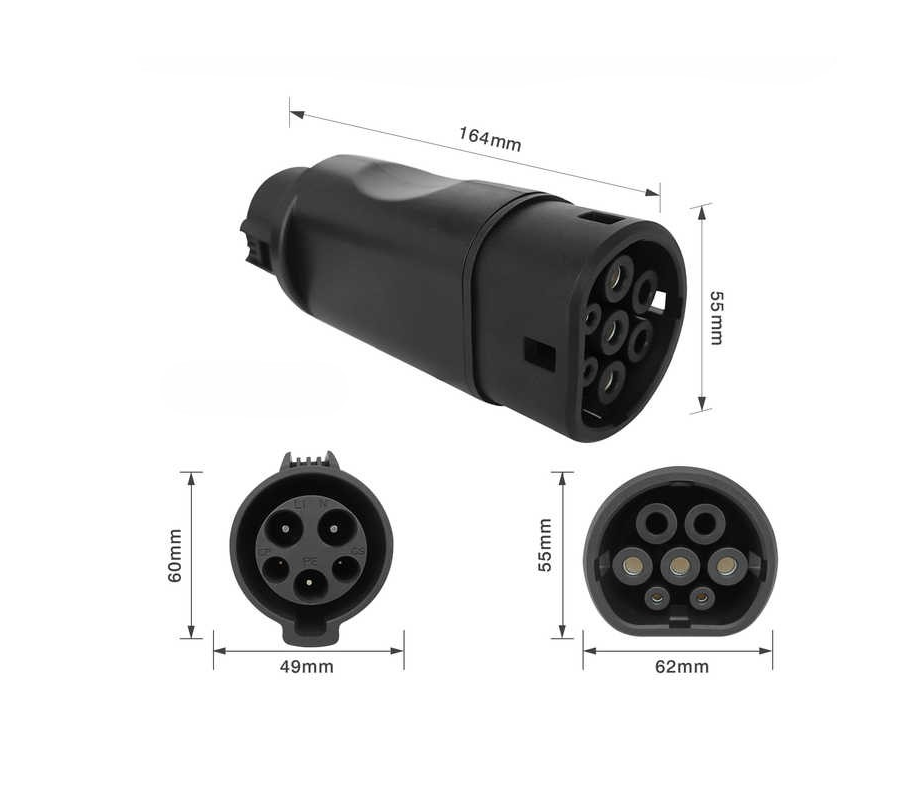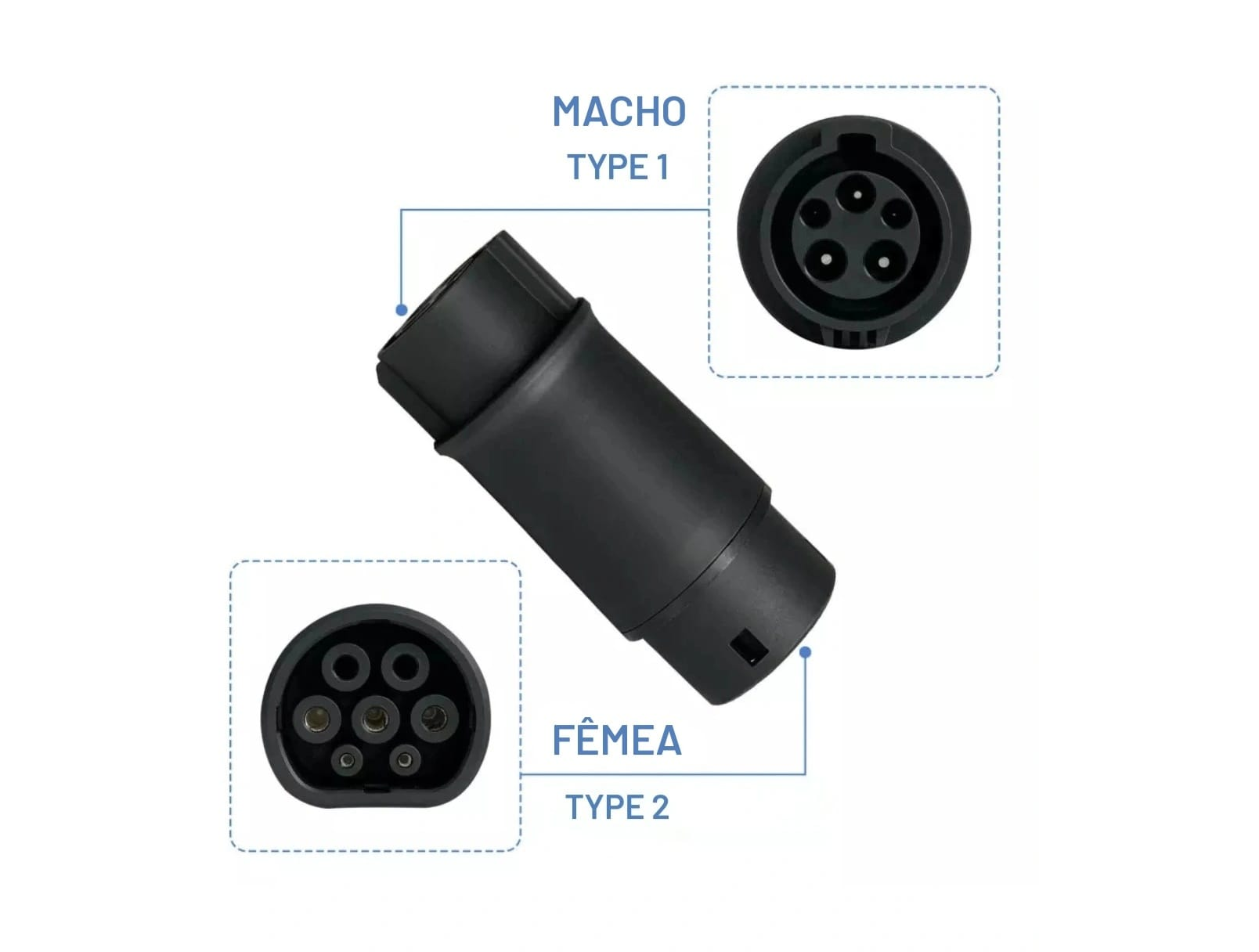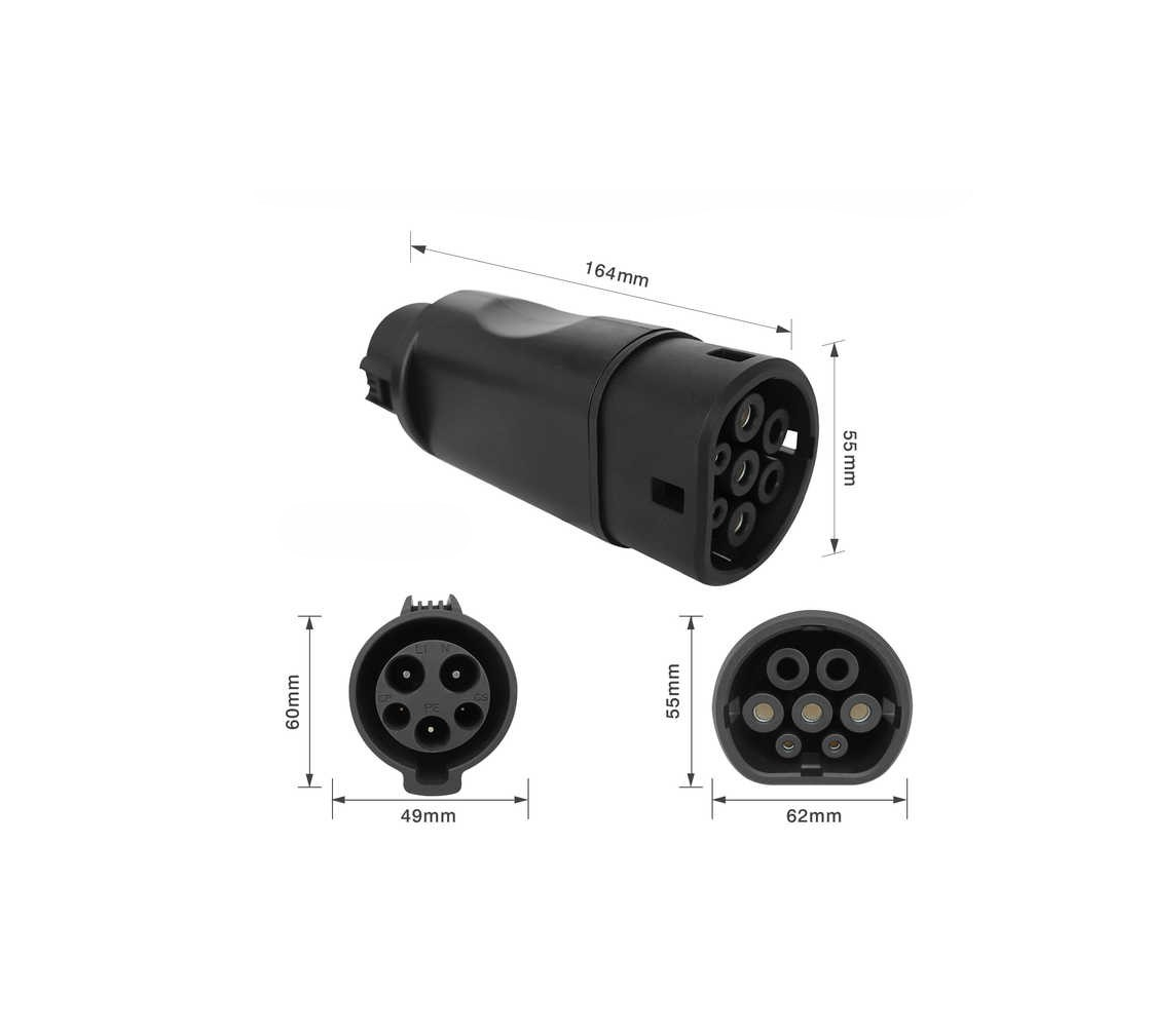 Adaptador Type1 – Type 2 32A 1 phase para em EVSEs ou cabos com ficha Mennekes Type 1.