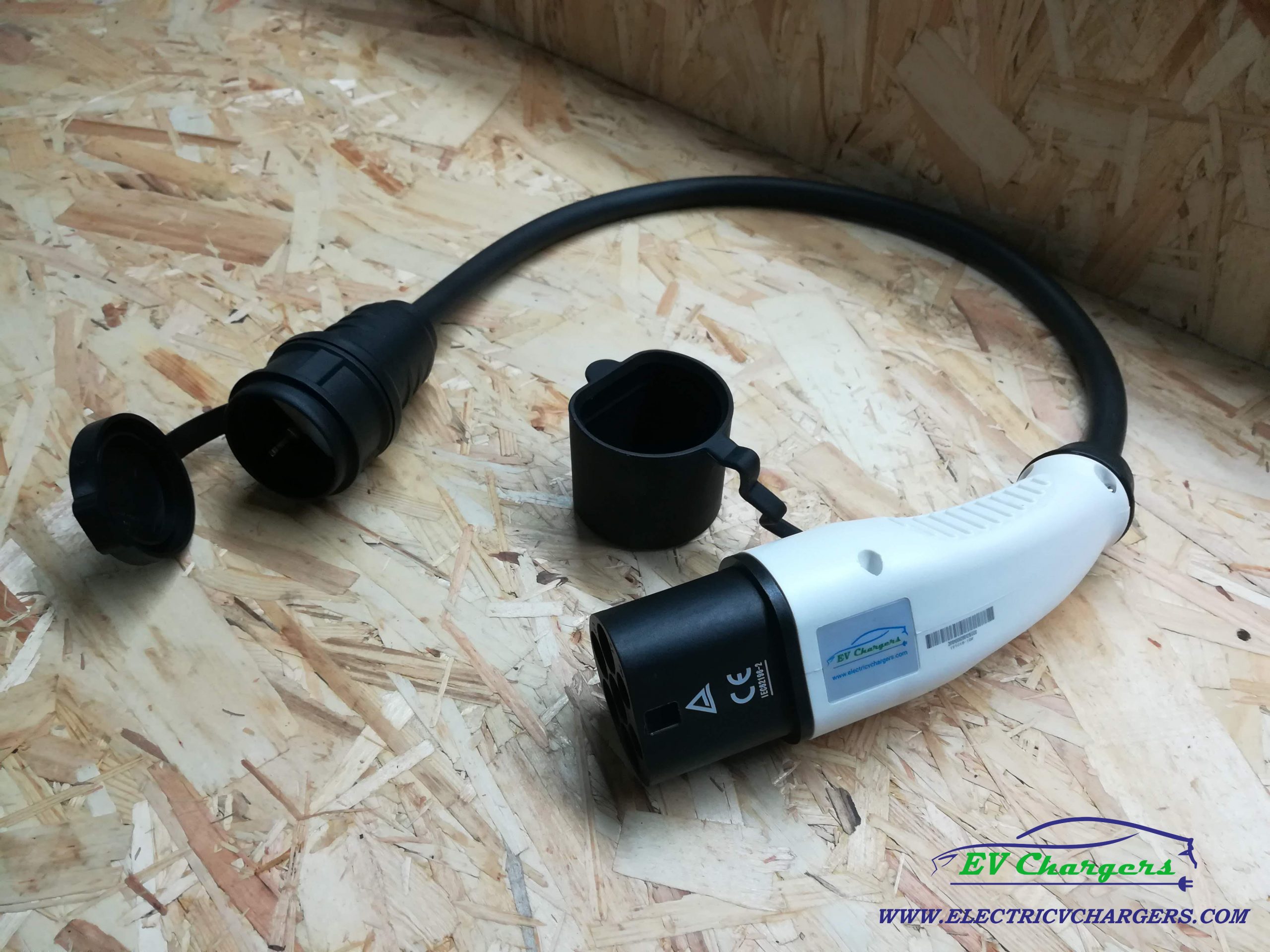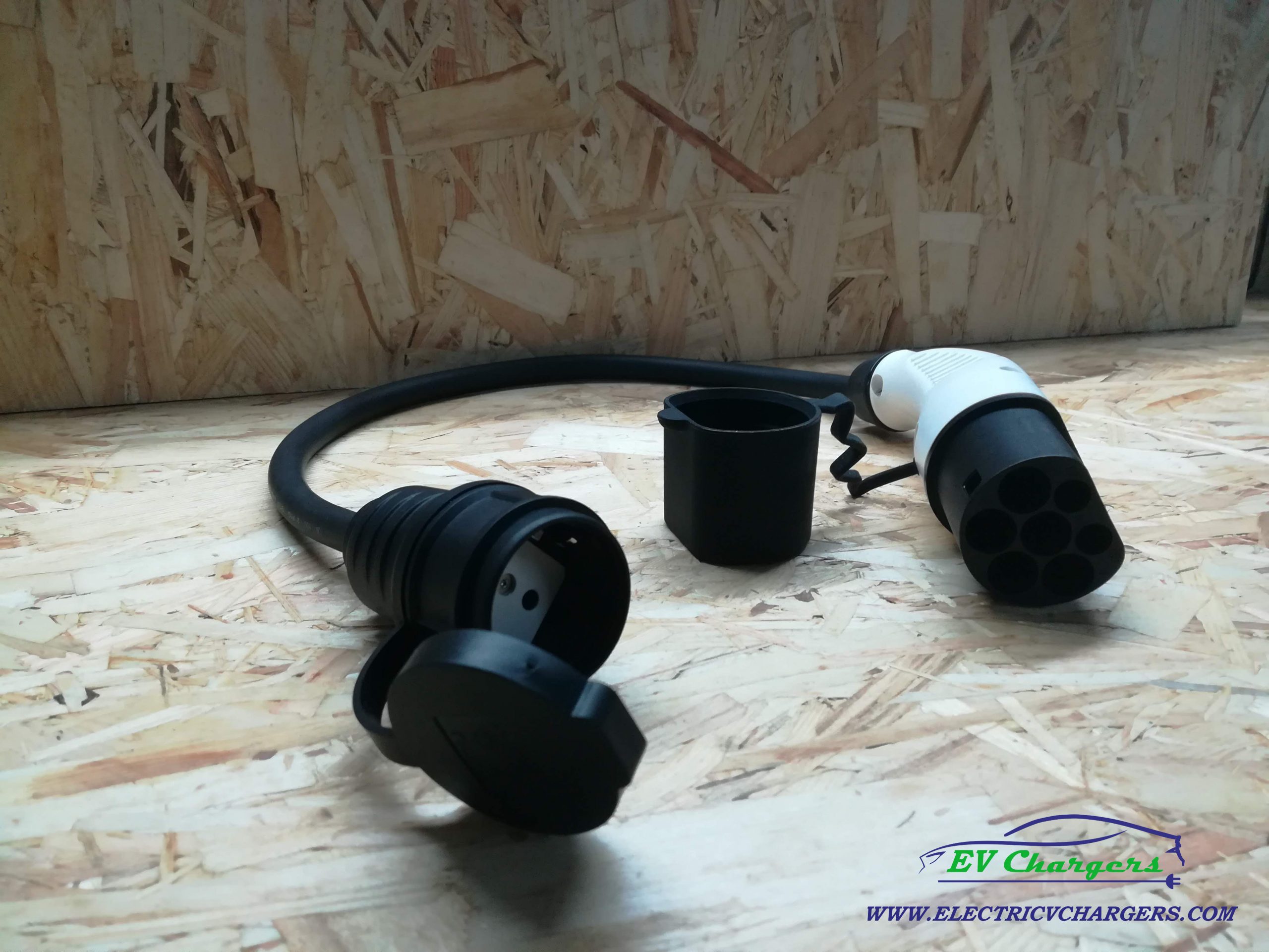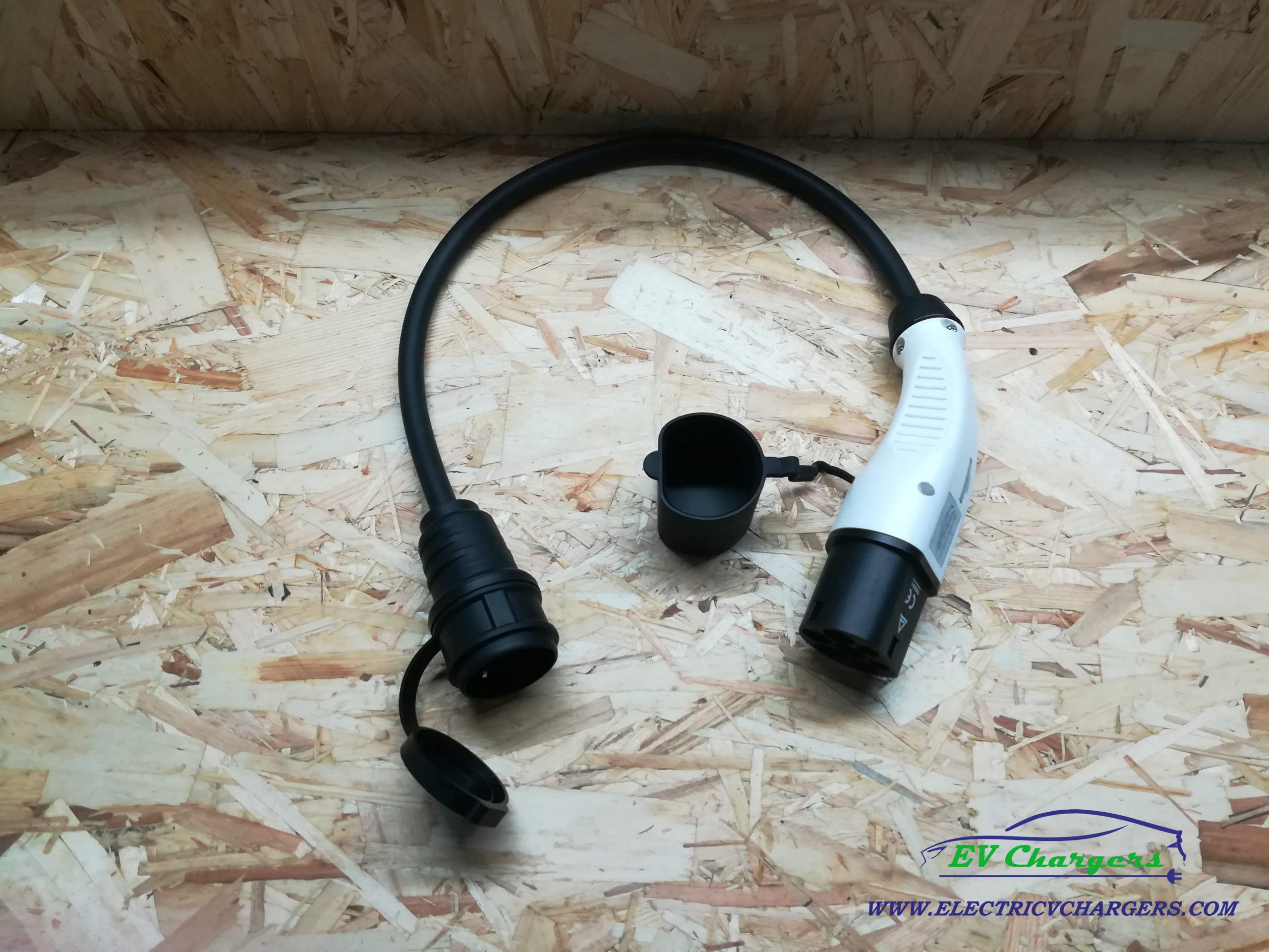 Adaptador ficha Schuko ou CEE 16A (3.7kw) para ficha Mennekes Type 2 c/ cabo 60cm para usar nos postos públicos de carregamento.