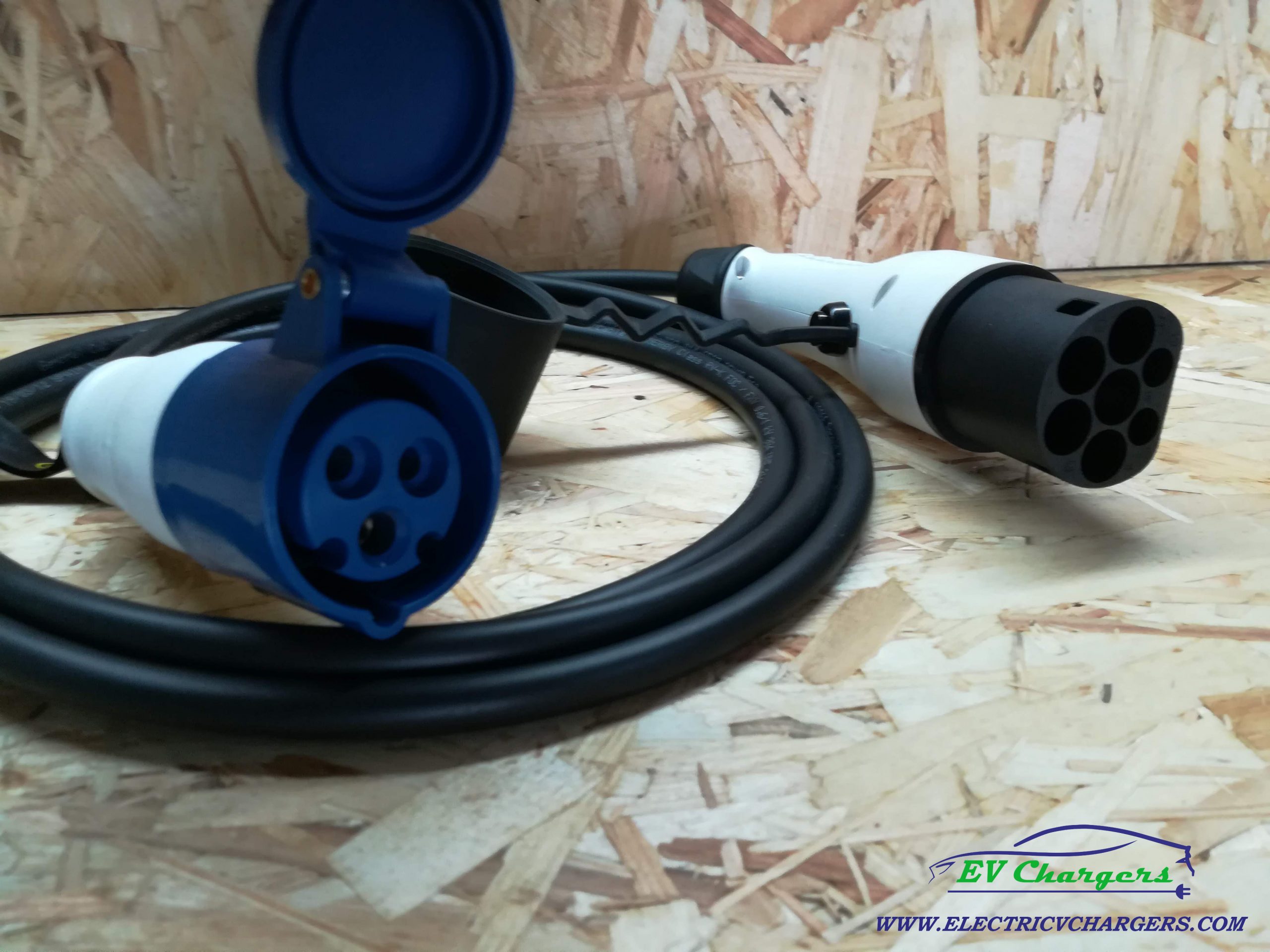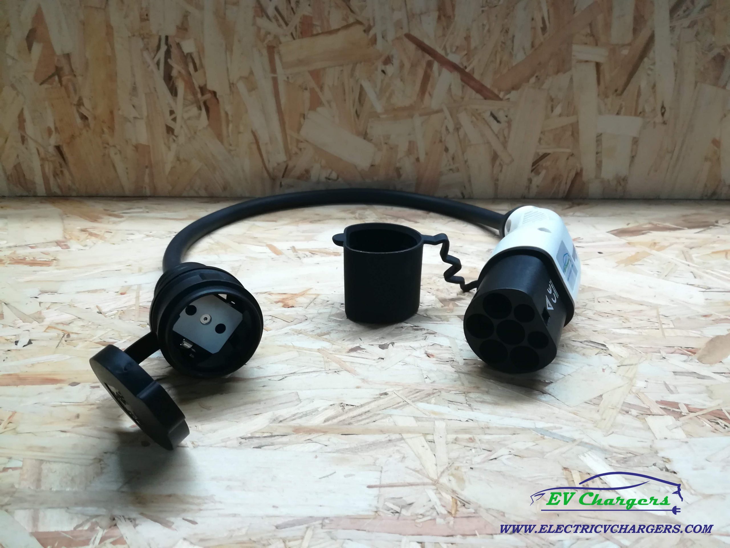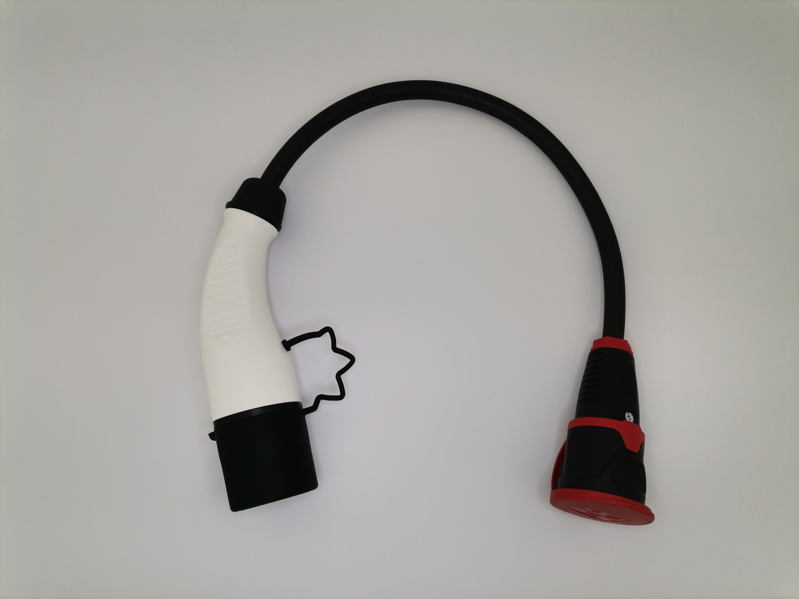Adaptador ficha Schuko ou CEE 16A (3.7kw) para ficha Mennekes Type 2 c/ cabo 60cm para usar nos postos públicos de carregamento.