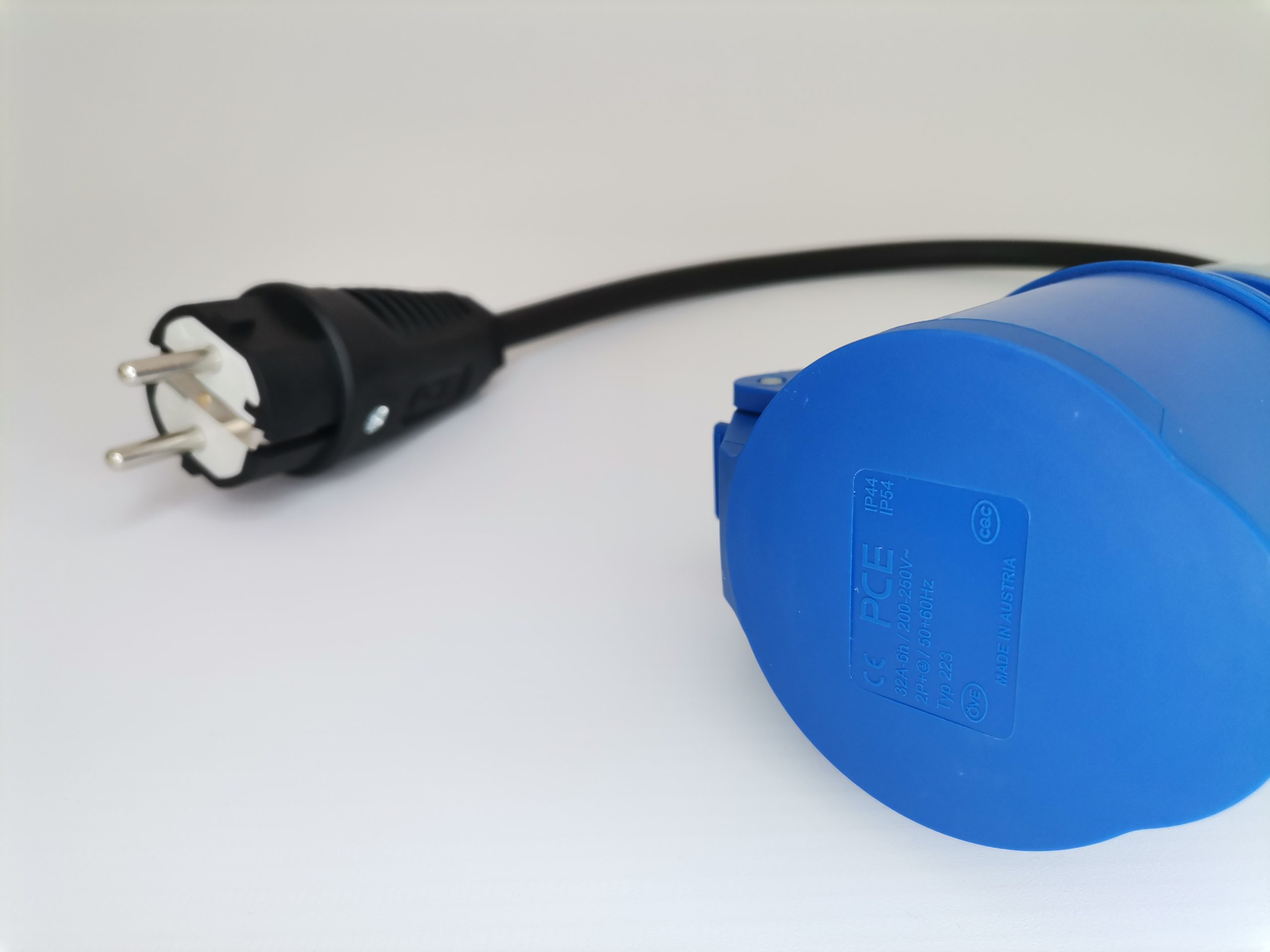 Adaptador de 60cm com cabo 3G4, fichas CEE 32A 1Phase Fêmea PCE e Schuko Macho PCE de elevado IP, terminais cravados e com isolamento.