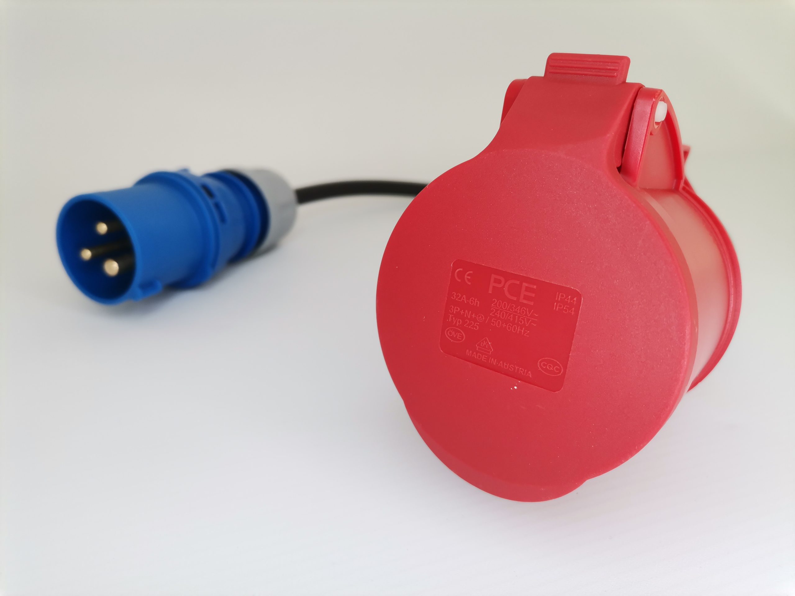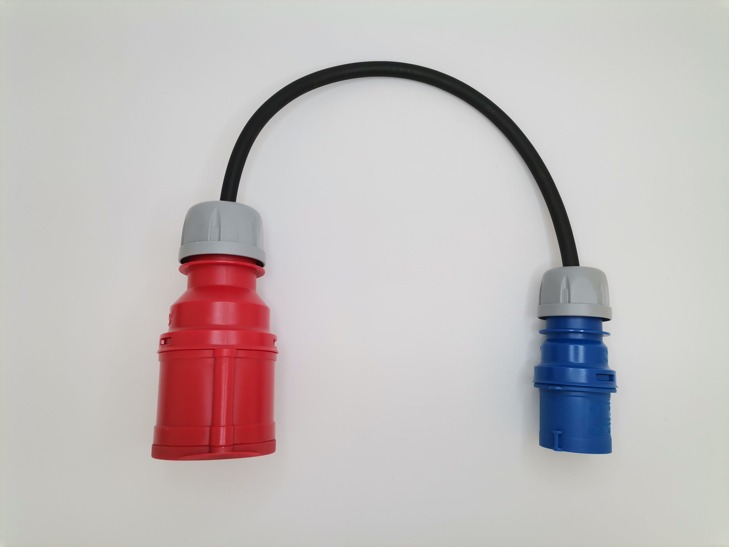 Adaptador de 60cm com cabo 3G4, fichas CEE 32A 3Phase Fêmea PCE e CEE 16A 1Phase Macho PCE de elevado IP, terminais cravados e com isolamento.